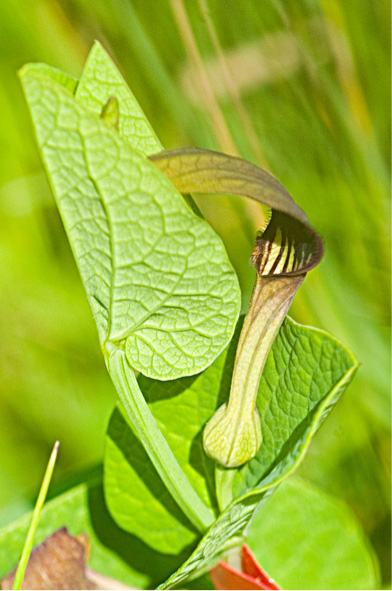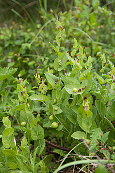 Abb. 1: Blühende und fruchtende Pflanze von Aristolochia rotunda in Kroatien (Foto: Birgit Oelschlägel, TU Dresden).Abb. 2: Blüte von Aristolochia rotunda. (Foto: Birgit Oelschlägel, TU Dresden)Abb. 3: Detailaufnahme einer Blüte von Aristolochia rotunda mit bestäubender Fliege. (Foto: Birgit Oelschlägel, TU Dresden)